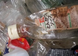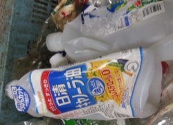 ペットボトルですがラベルがついてます。ペットボトルを出す時は、中をゆすいでキャップとラベルを外して出してください。 |